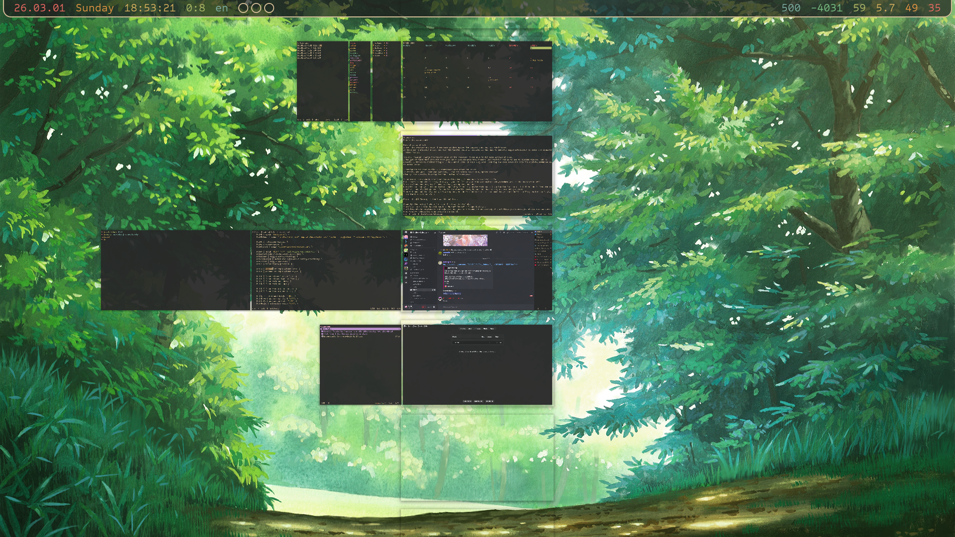 On login, the reminder thingy, chore tracker, calendar is created onto workspace three. Yazi opened in the anime directory and anki on workspace four. Yet on the main workspace, workspace one, I still start out with my terminal window and the browser. Less things to have to create manually! Pretty nice.